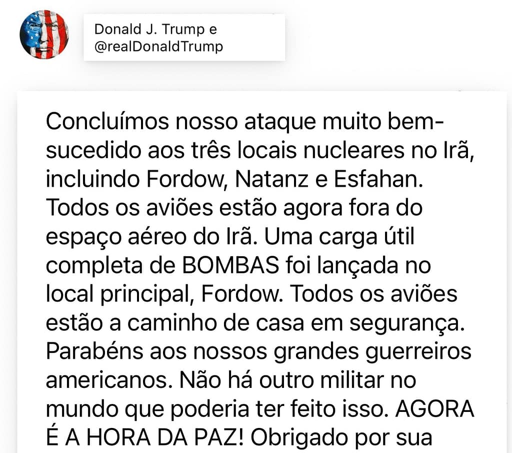 Todos os aviões estão agora fora do espaço aéreo do Irã. Uma carga útil completa de BOMBAS foi lançada no local principal, Fordow. Todos os aviões estão a caminho de casa em segurança.
