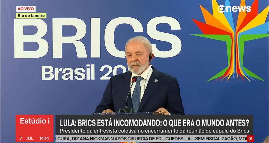 Durante entrevista na 17ª Cúpula do Brics, no Rio de Janeiro, Lula foi questionado sobre a postagem que Trump em defesa Bolsonaro (leia mais abaixo).