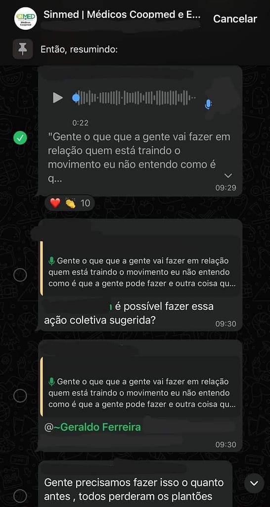 No grupo, dirigentes discutem possíveis medidas jurídicas contra médicos que aceitaram prestar serviço por meio de outras empresas após a derrota da Coopmed no pregão eletrônico. O tom é de acusação de “traição” ao movimento, quando, na prática, trata-se de médicos que buscam alternativas para garantir renda e manter suas atividades. A conduta, em termos jurídicos, se aproxima de assédio e coação.