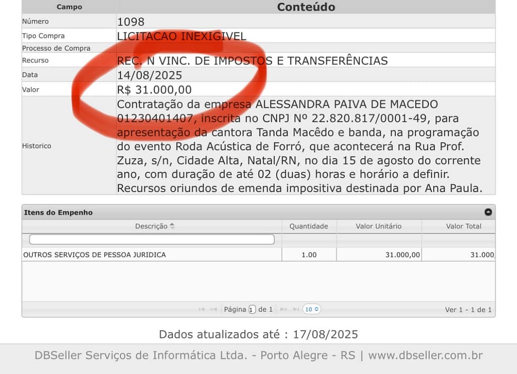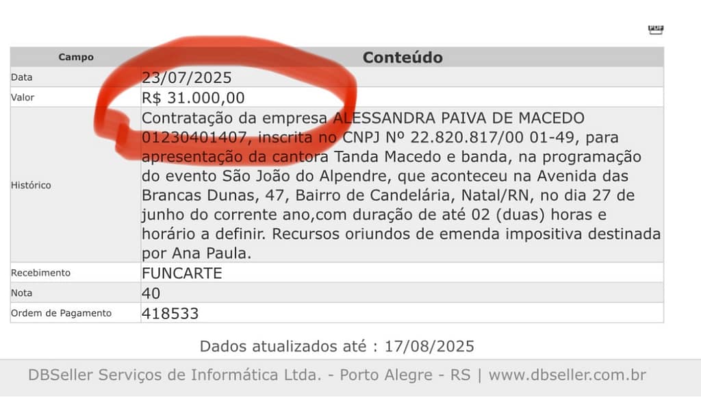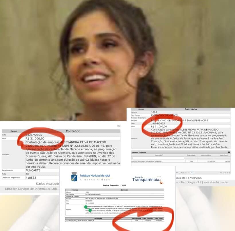 Após as denúncias sobre suspeitas de gastos com artistas para festas políticas em Natal, surgem novos questionamentos. A ex-vereadora Ana Paula destinou em apenas dois meses quase 100 mil reais para contratar a Cantora TANDA Macedo, sem contar o tal “ROLÊ VERMELHO” que foi mais outro cachê. Com uma cidade com tantas necessidades o que faz uma parlamentar destinar tanto dinheiro para uma cantora em tão pouco tempo?