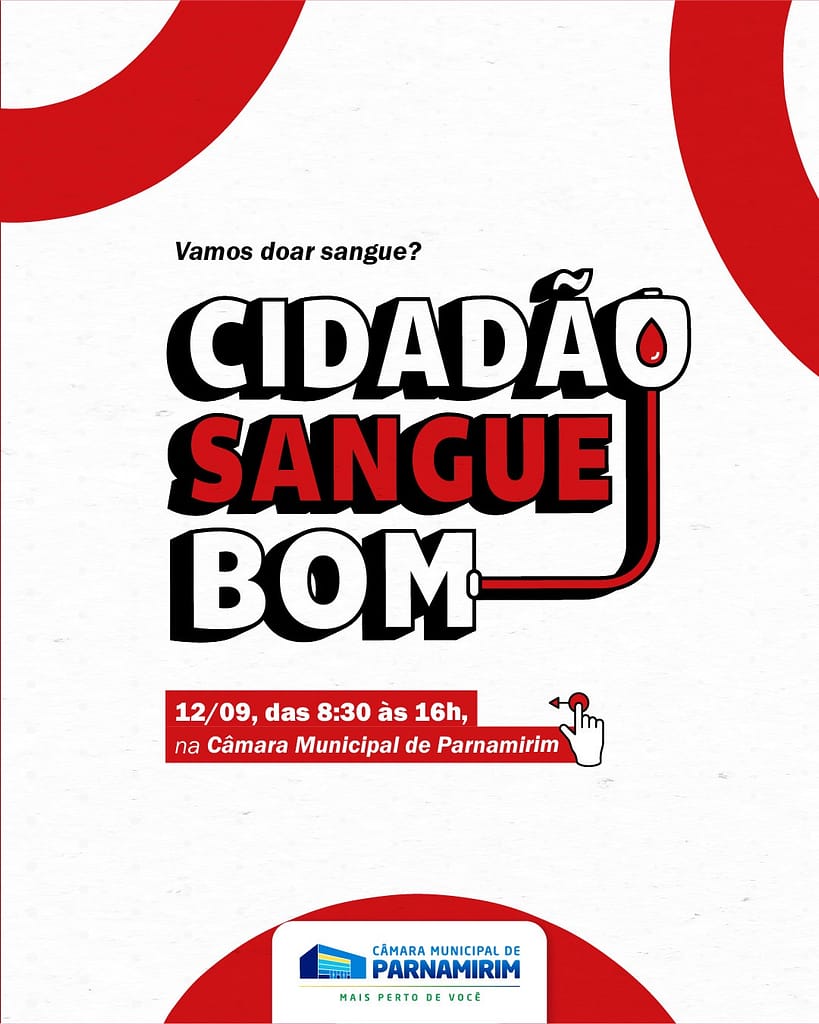 A Câmara de Parnamirim, em parceria com o Hemonorte, realiza a campanha “Cidadão Sangue Bom” para incentivar a doação de sangue no município, na próxima sexta-feira (12), a partir das 8h30 até as 16h. Na ocasião, os parnamirinenses podem se dirigir ao prédio da Casa Legislativa que vai funcionar como ponto de coleta, aberto a todos que desejarem contribuir com esse gesto de solidariedade e salvar vidas.