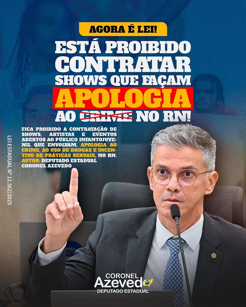 Agora é Lei no Rio Grande do Norte. Foi sancionada a Lei nº 12.562, de autoria do deputado estadual Coronel Azevedo (PL), que proíbe a contratação, pela administração pública estadual, de shows, artistas e eventos acessíveis ao público infantojuvenil que façam apologia ao crime, ao uso de drogas ou incentivem práticas sexuais.