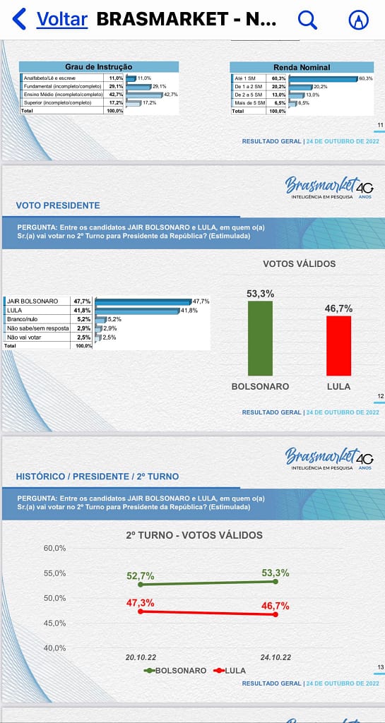Na pesquisa anterior, realizada de 15 a 19 de outubro, Lula e Bolsonaro também estavam tecnicamente empatados. O petista tinha 51,3% dos votos válidos e o chefe do Executivo, 48,7%.